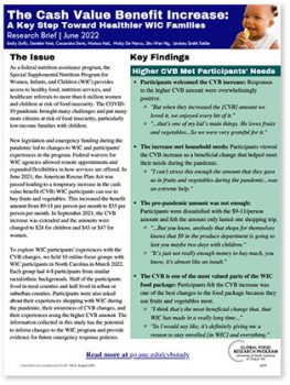 To explore WIC participants’ experiences with the CVB changes, researchers at UNC-Chapel Hill held 10 online focus groups with WIC participants in North Carolina in March 2022. Each group had 4–8 participants from similar racial/ethnic backgrounds. Half of the participants lived in rural counties and half lived in urban or suburban counties. Participants were asked about their experiences shopping with WIC during the pandemic, their awareness of CVB changes, and their experiences using the higher CVB amount. The information collected in this study has the potential to inform changes to the WIC program and provide evidence for future emergency response policies. Key findings include: