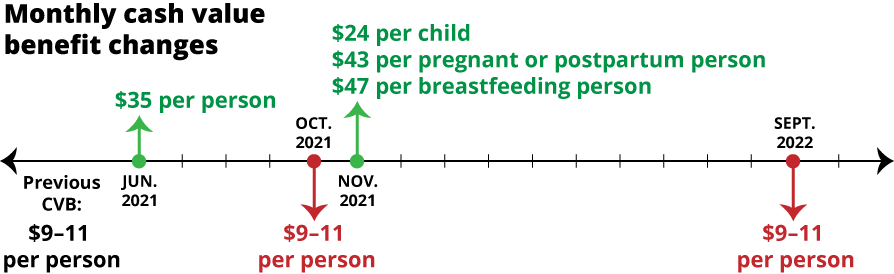 Beginning in June 2021, the American Rescue Plan Act provided a temporary increase in the cash value benefit (CVB) or voucher for WIC participants to buy fruits and vegetables. This increased the monthly CVB voucher amount from $9–11 per person to $35 per person. In September 2021, this temporary increase was extended, and the monthly benefit amounts were changed to $24 per child and $43–$47 for women (depending on whether they are pregnant, postpartum, or breastfeeding).