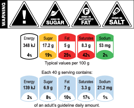 - The probability of correctly identifying products high in sugar, salt, or saturated fats was nearly twice as high for certain products when they featured a nutrient warning label vs. a traffic light or Guideline Daily Amounts label.