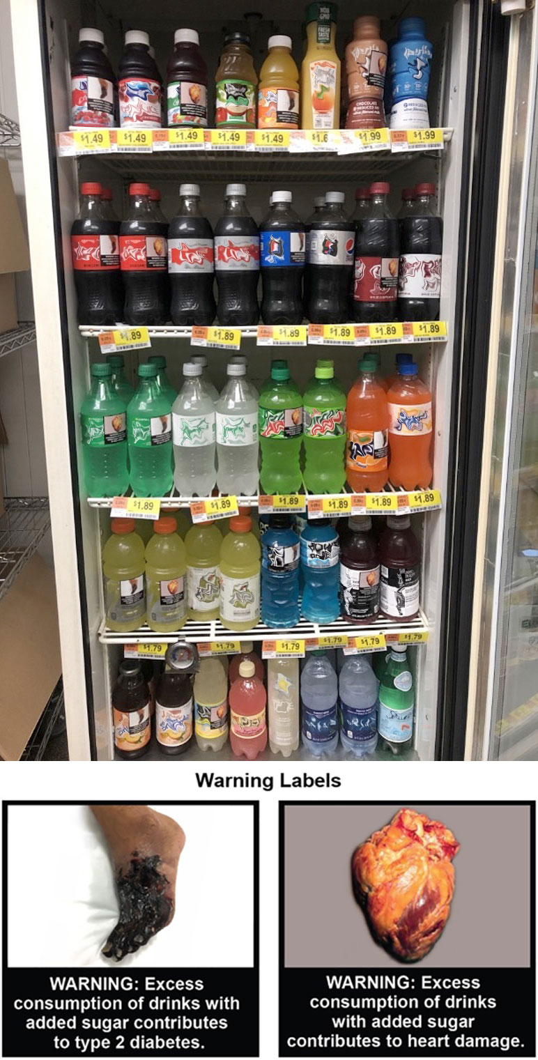 In the experiment, one group of parents shopped from a beverage selection that included pictorial warnings on the sugary drink options (right); the other group shopped the same beverage selection, but with no warnings on the sugary drinks.