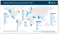 Global maps showing countries and smaller jurisdictions with taxes on sugary or sweetened beverages and/or unhealthy foods that were implemented with a goal of curbing sugar, salt, saturated or trans fat, and excessive calorie consumption and improving public health. Included are brief descriptions of each tax structure and dates of passage or implementation.